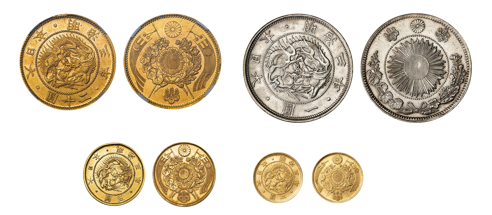 明治3年に日本で初めての近代貨幣として発行されたのは、(1)旧20円金貨(2)旧5円金貨(3)旧2円金貨(4)旧1円銀貨(5)旭日竜大型50銭銀貨(6)旭日竜20銭銀貨(7)旭日竜10銭銀貨(8)旭日竜5銭銀貨の8種類でした。