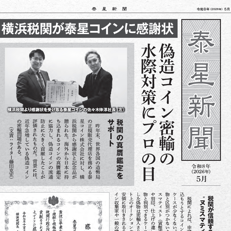 横浜税関が泰星コインに感謝状 偽造コイン密輸の水際対策にプロの目2026年04月01日コインニュース -